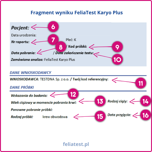 3. PŁEĆ PŁODU: Może być męska lub żeńska jeżeli pacjentka wyraziła życzenie określenia płci (jest to w cenie badania FeliaTest Karyo Plus i FeliaTest RHD).