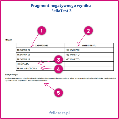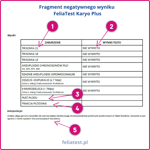 Wynik testu FeliaTest jest przedstawiony w prosty sposób. Zawiera informacje czy nadane nieprawidłowości zostały wykryte czy nie. Co ważne, w cenie badania jest konsultacja z lekarzem genetykiem klinicznym jeśli test wykryje nieprawidłowości. Dzięki temu nie zostaniesz z wynikiem sama, lekarz wyjaśni Ci go i zaleci dalsze postępowanie.