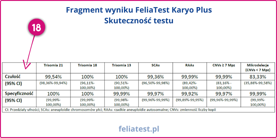 • FeliaTest Karyo Plus bada ponad 188 nieprawidłowości genetycznych: 3 najczęstsze trisomie, rzadkie trisomie oraz monosomie, zmiany liczby chromosomów XY, delecje i duplikacje (≥ 7M pz) oraz 9 mikrodelecji (3-7 Mpz).